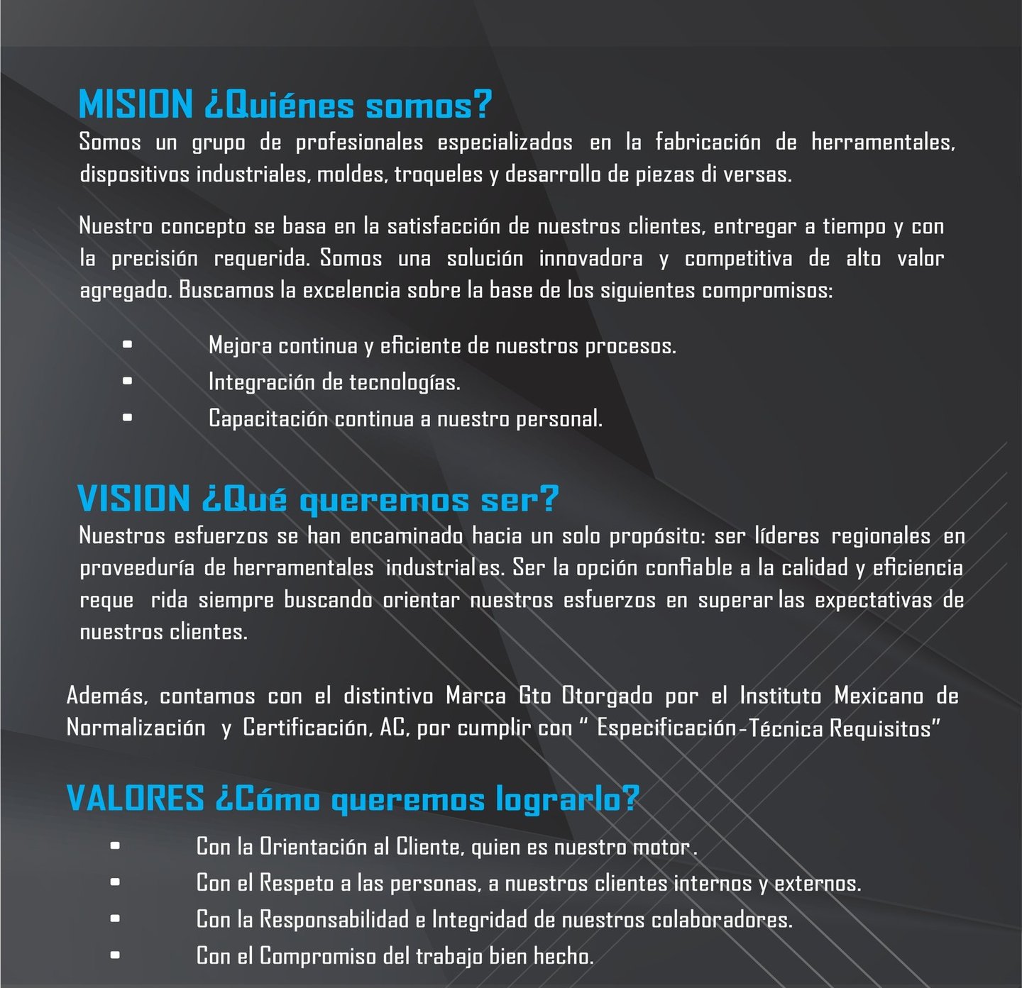Nuestra filosofía se basa en la mejora continua, la integración de tecnologías y la capacitación constante de nuestro personal para garantizar la satisfacción del cliente.